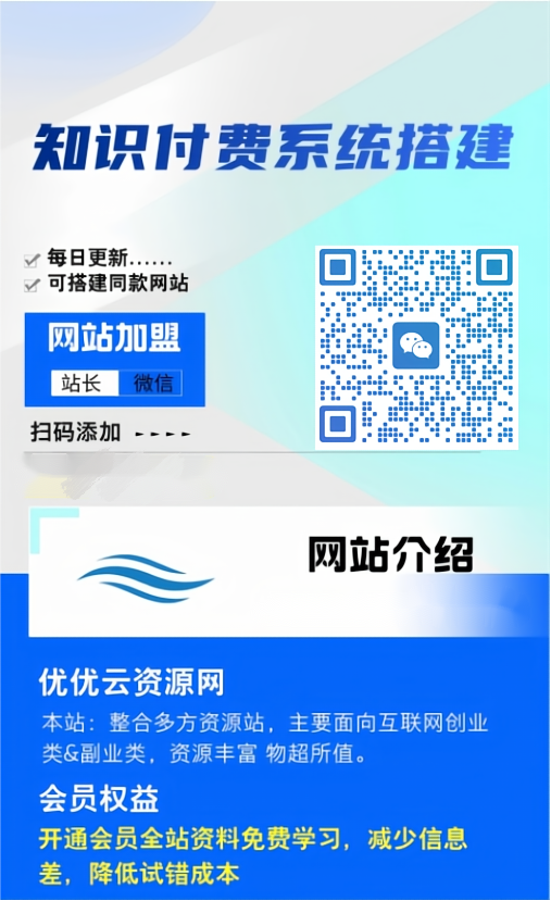 加盟优优云网创,加盟搭建同款知识付费资源网站,实现长期稳定被动收入~